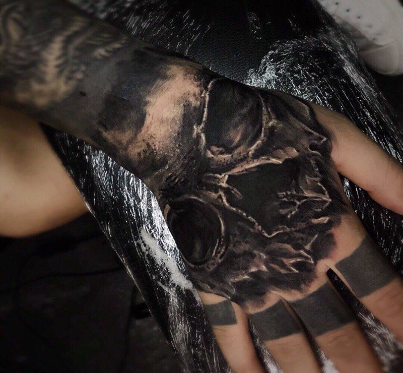 爆手//骷髅纹身图片_手部欧美写实纹身图案