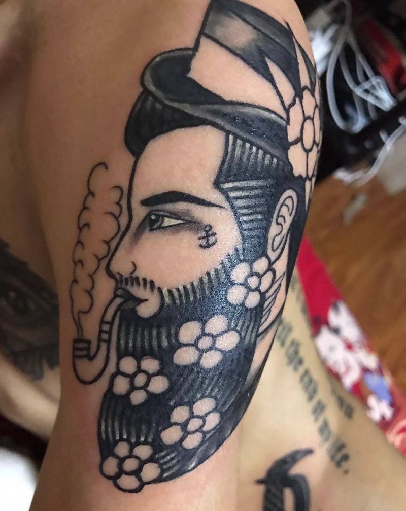 • T包小腿吹火男+阿多福纹身图片_腿部老传统新传统吹火男阿