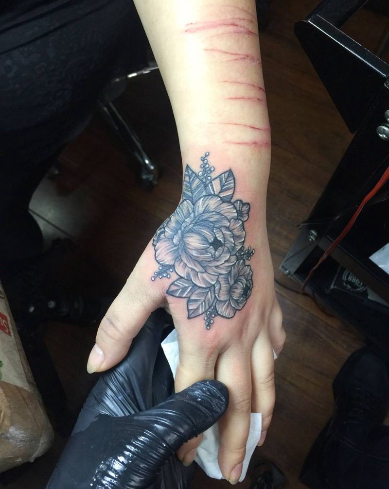 • 手背潮流时尚的玫瑰花眼睛纹身图案