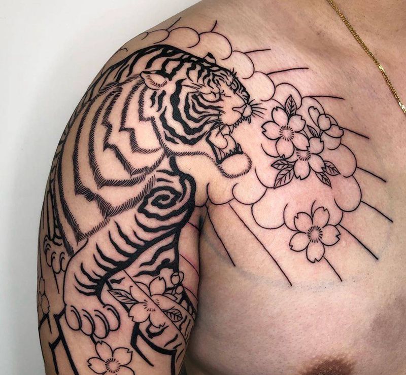 日式传统半甲虎啸纹身图片_胸部手臂老传统纹身图案