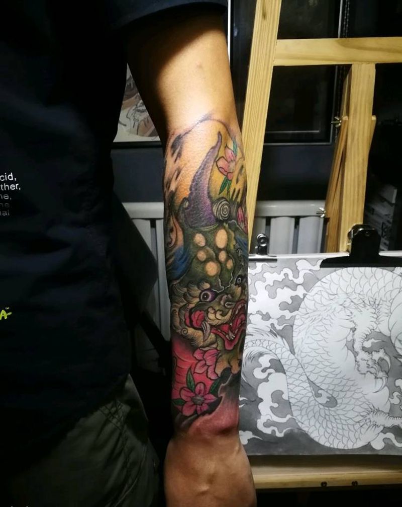 当前位置: 首页 >陕西省宝鸡市纹身店-甲古纹刺青纹身图案>唐狮纹身图片_手臂新传统纹身图案