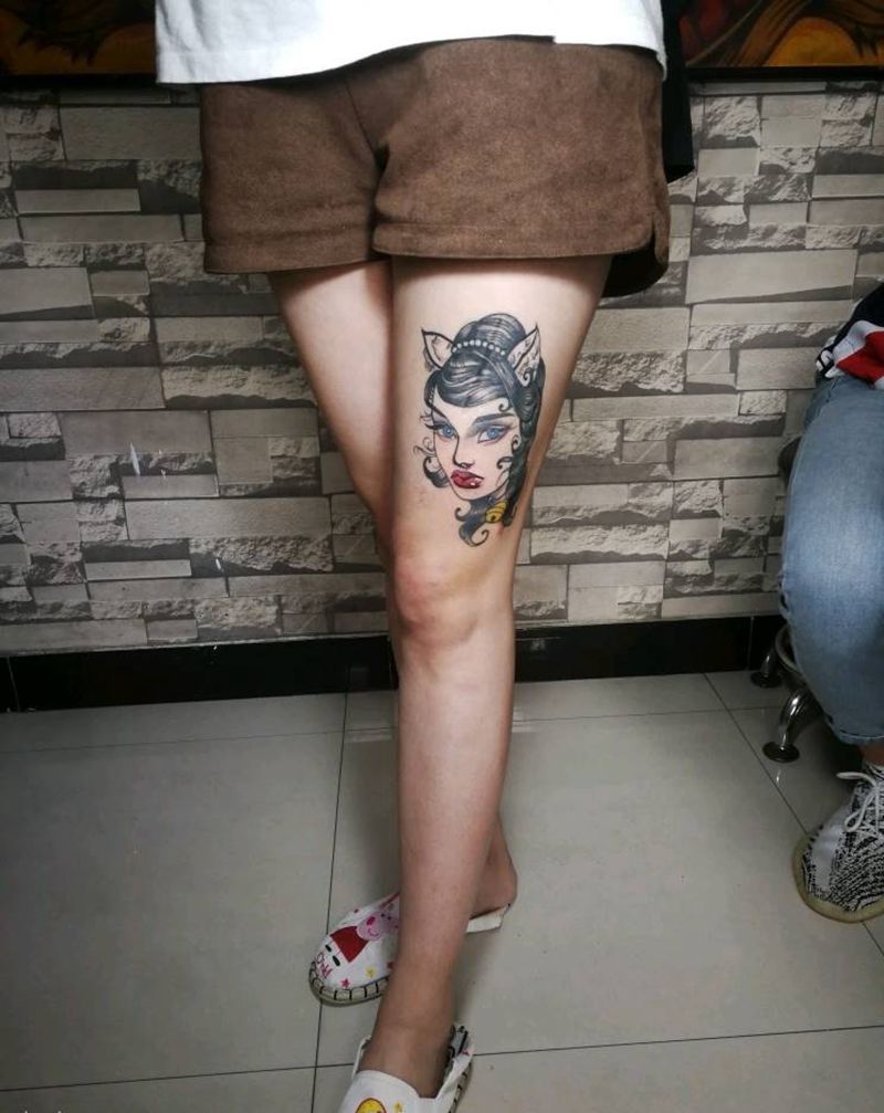 姑娘纹身图片_腿部纹身图案
