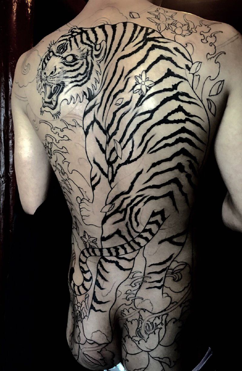 满背虎未完成,靳凯作品纹身图片_背部臀部老传统新传统原创老虎满背纹身图案