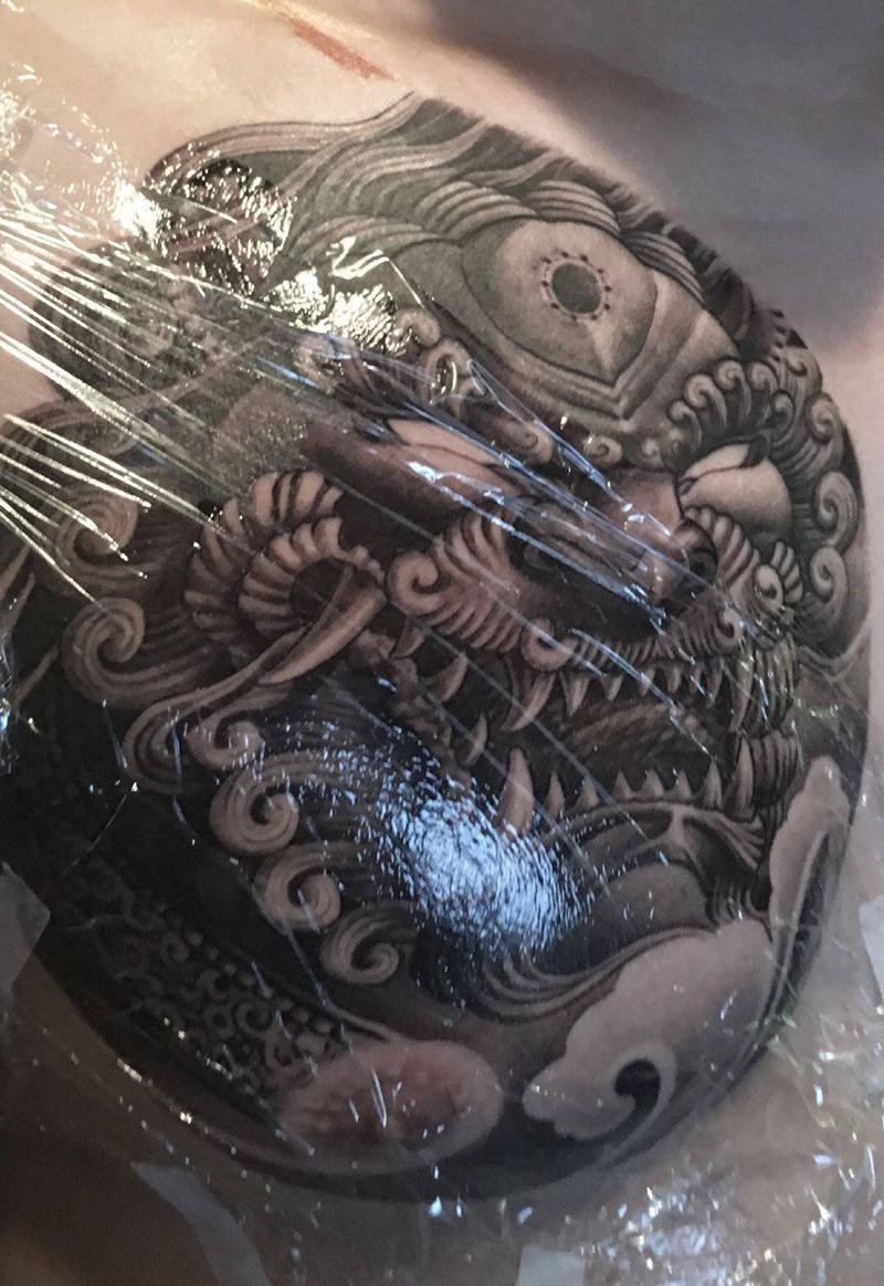 唐狮。靳凯原创作品纹身图片_肩部胸部老传统新传统原创瑞兽宗教纹身图案