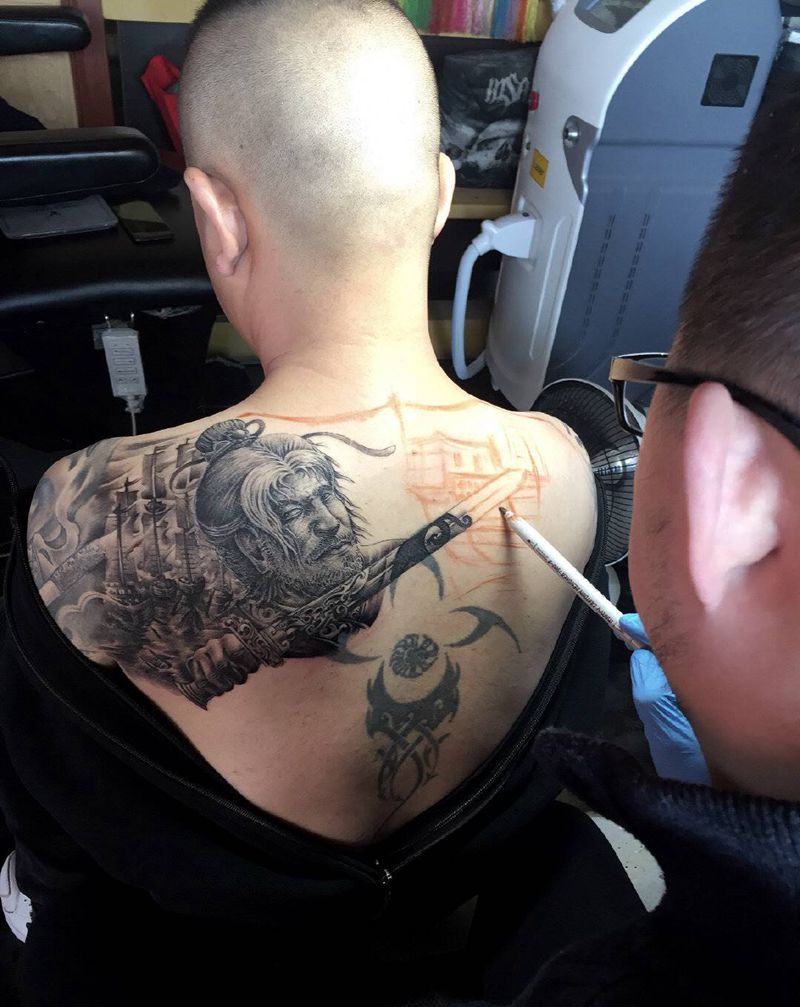 满背未完成 靳凯原创作品纹身图片_背部肩部老传统新传统原创满背刀马纹身图案