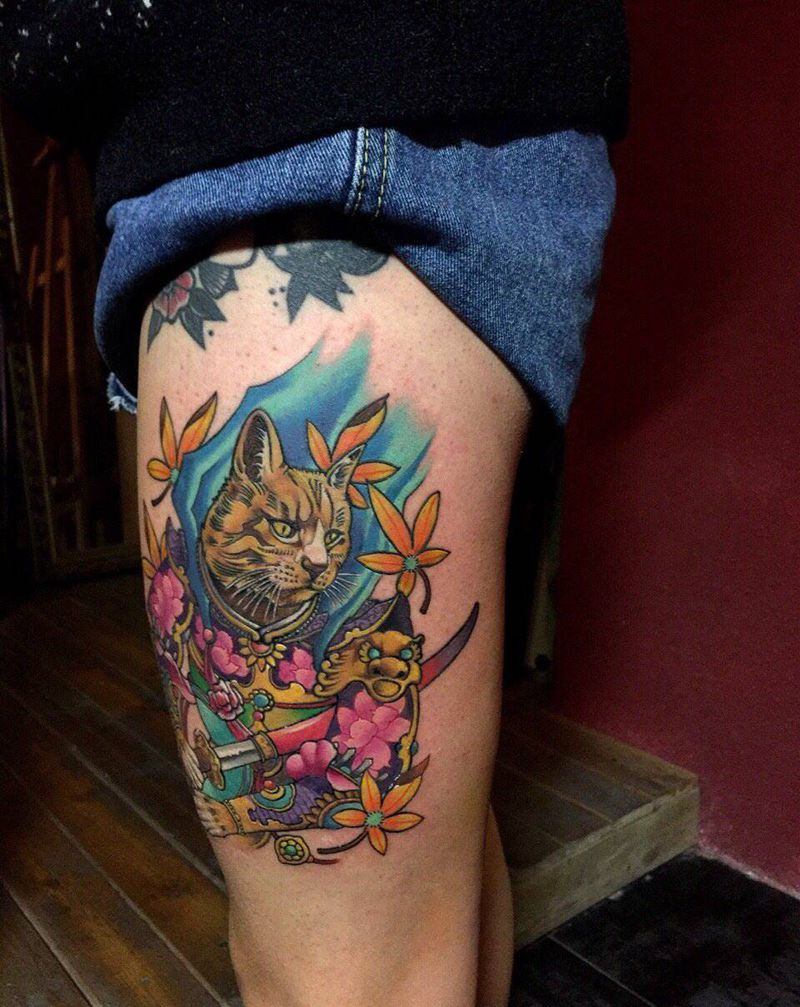 当前位置: 首页 >甘肃省兰州市纹身店-兰州赤炎刺纹身工作室纹身图案>盔甲猫,靳凯原创作品纹身图片_臀部腿部New School水彩彩色动物原创纹身图案