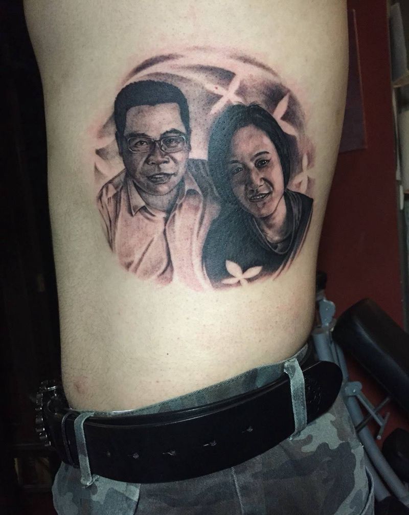 当前位置: 首页 >甘肃省兰州市纹身店-兰州赤炎刺纹身工作室纹身图案>客人父母肖像纹身图片_成品腰部写实肖像人物原创纹身图案
