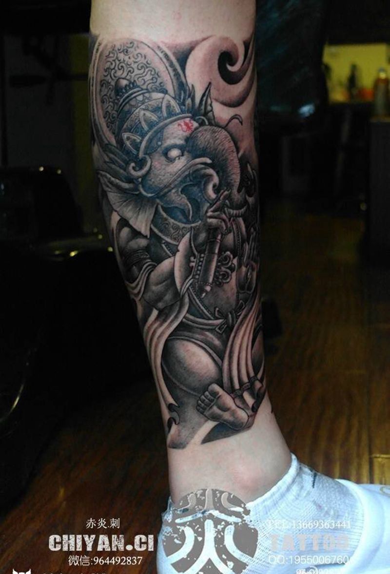 大笑金刚、象神包小腿纹身图片_成品腿部传统肖像习俗动物鬼神宗教原创纹身图案