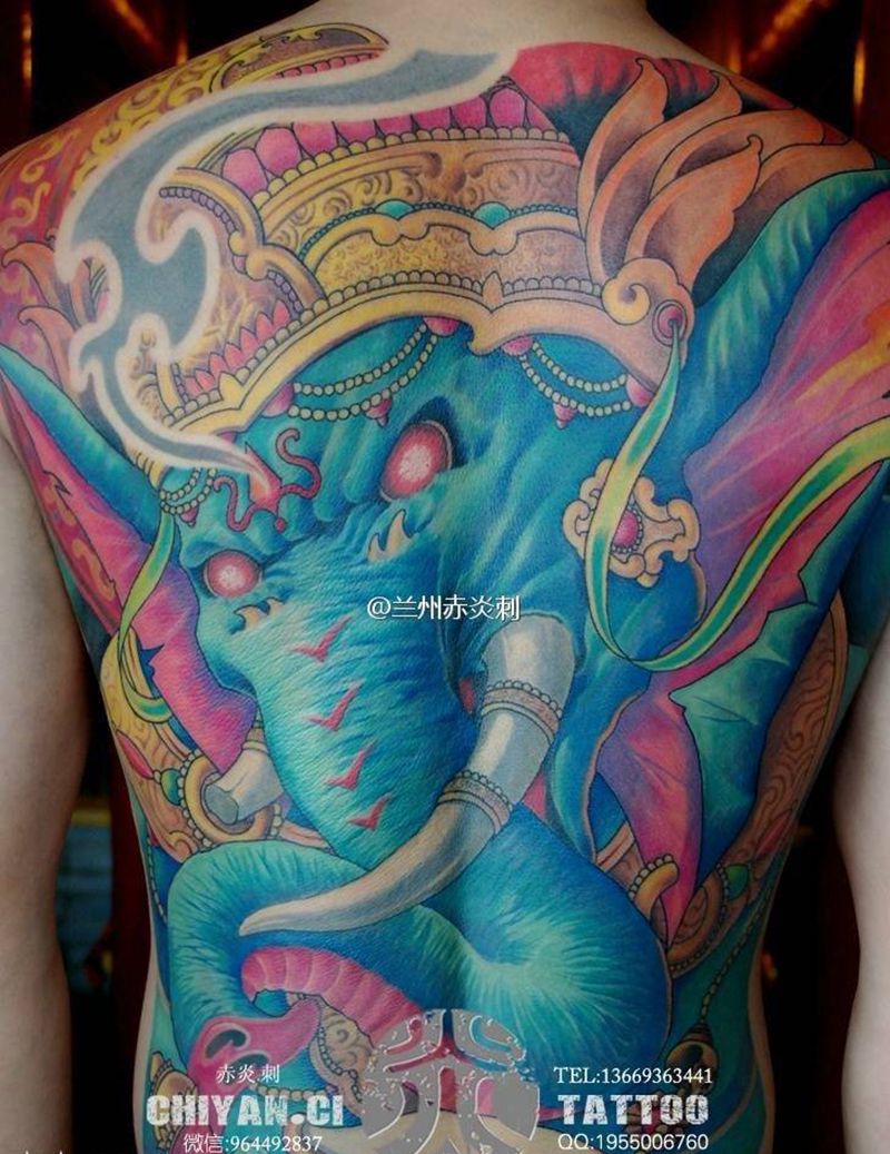 当前位置: 首页 >甘肃省兰州市纹身店-兰州赤炎刺纹身工作室纹身图案>满背象神已恢复纹身图片_成品背部传统写实鬼神人物宗教原创动物纹身图案