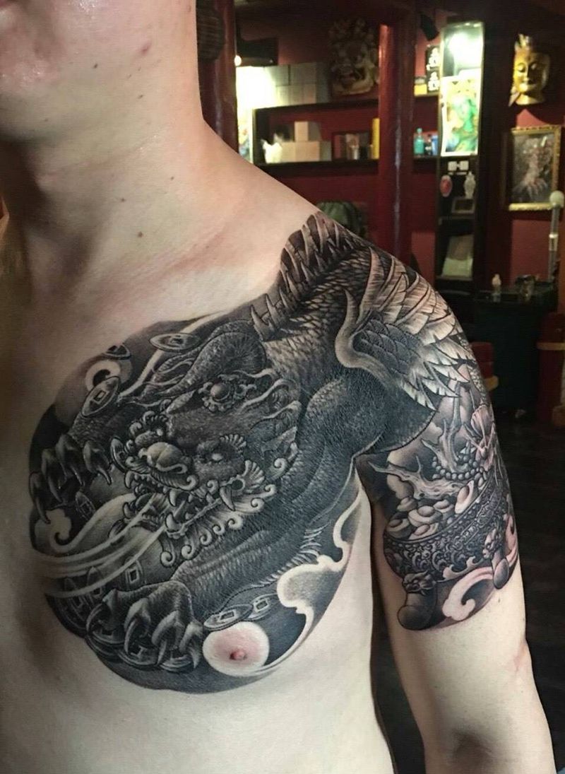 当前位置: 首页 >甘肃省兰州市纹身店-兰州赤炎刺纹身工作室纹身图案>半胛貔貅,靳凯作品纹身图片_肩部手臂新传统老传统貔貅聚宝盆原创纹身图案