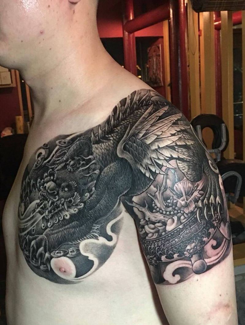半胛貔貅,靳凯作品纹身图片_肩部手臂新传统老传统貔貅聚宝盆原创纹身图案
