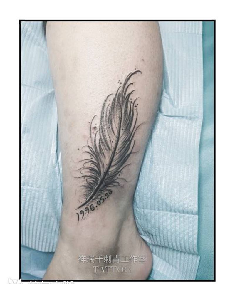 羽毛和数字纹身图片_腿部新传统羽毛字母纹身图案