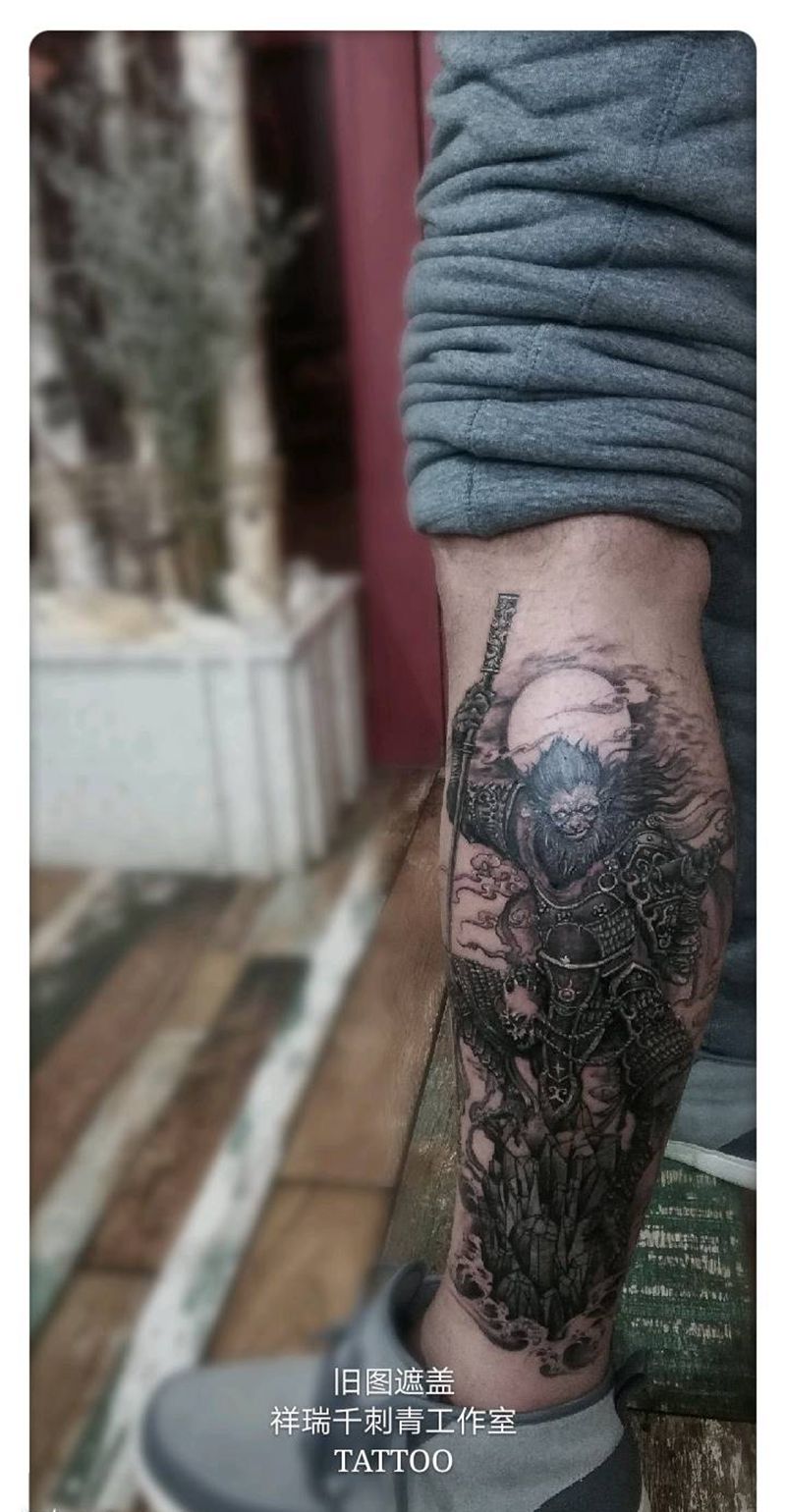 旧图遮盖~斗战胜佛悟空纹身图片_腿部新传统旧图遮盖纹身图案