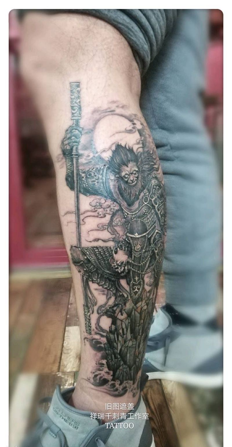 旧图遮盖~斗战胜佛悟空纹身图片_腿部新传统旧图遮盖纹身图案