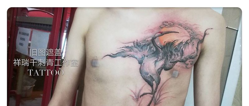 旧图遮盖~《鹤》纹身图片_胸部水墨鹤中国风花胸纹身图案