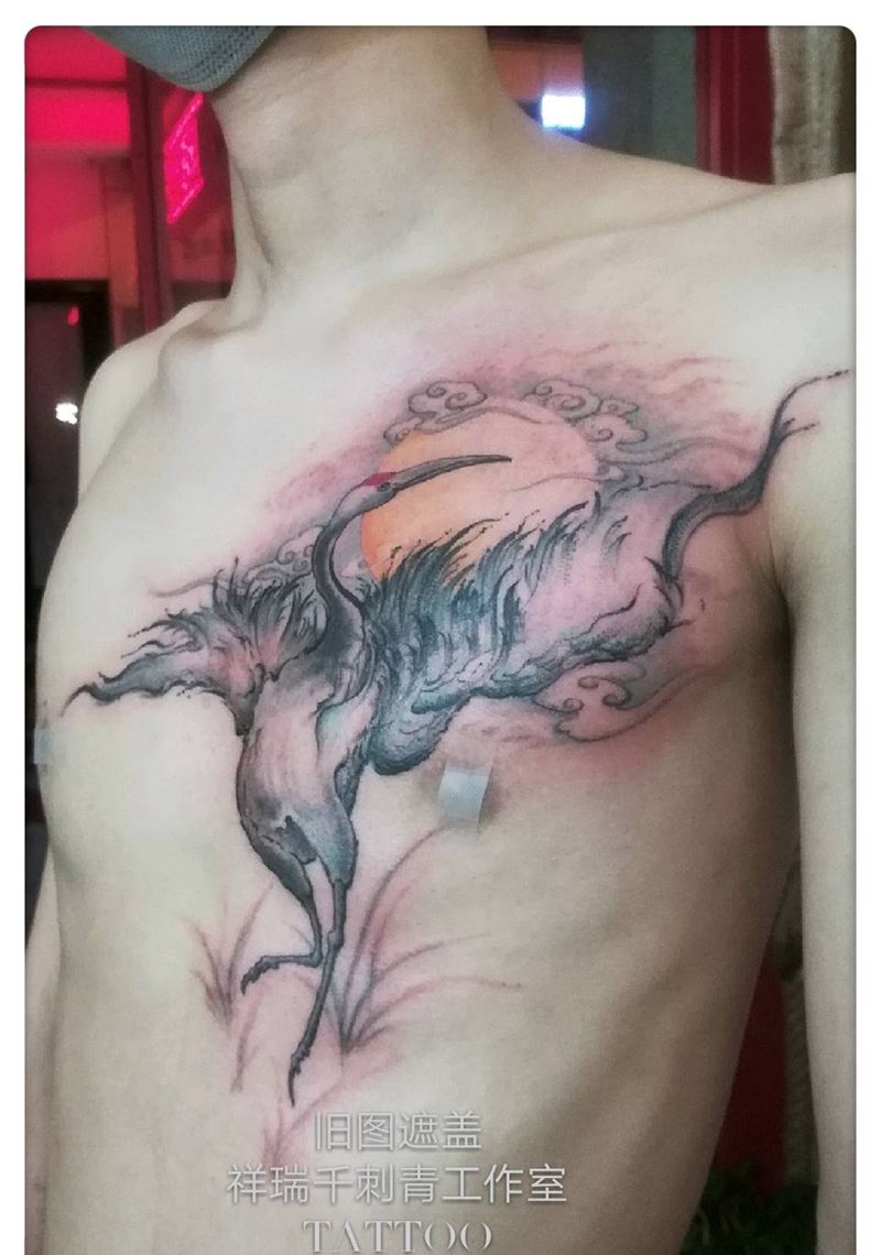 旧图遮盖~《鹤》纹身图片_胸部水墨鹤中国风花胸纹身图案