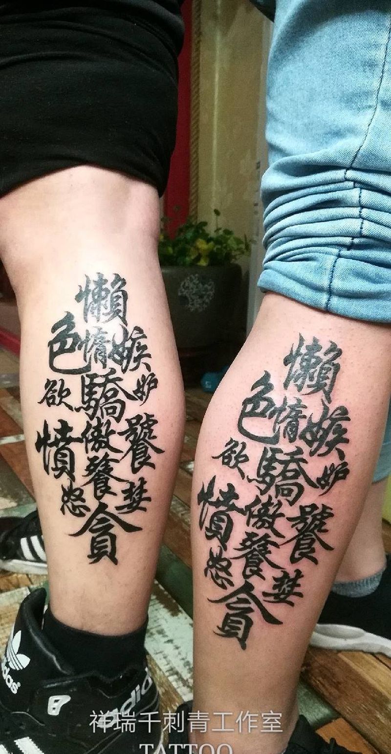 七宗罪纹身图片_腿部水墨书法字体纹身图案