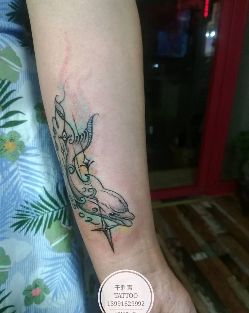 海豚纹身图片_手臂情侣纹身图案