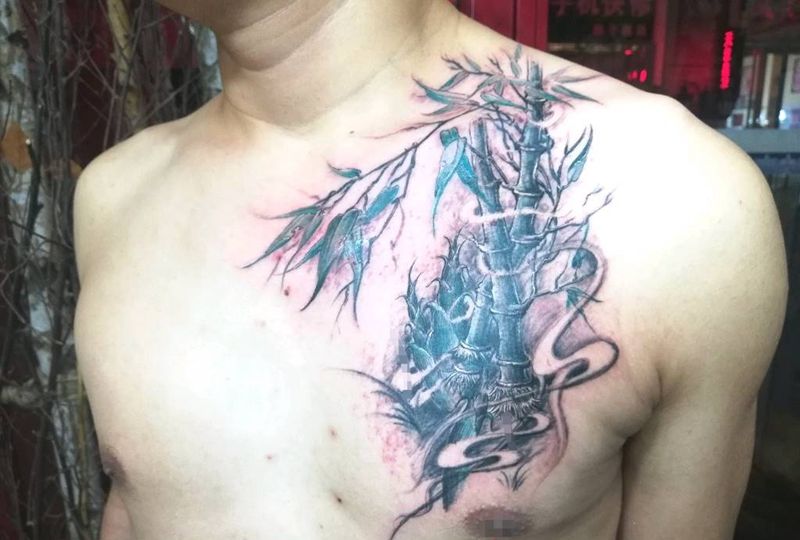 兄有成竹纹身图片_胸部新传统水墨纹身图案