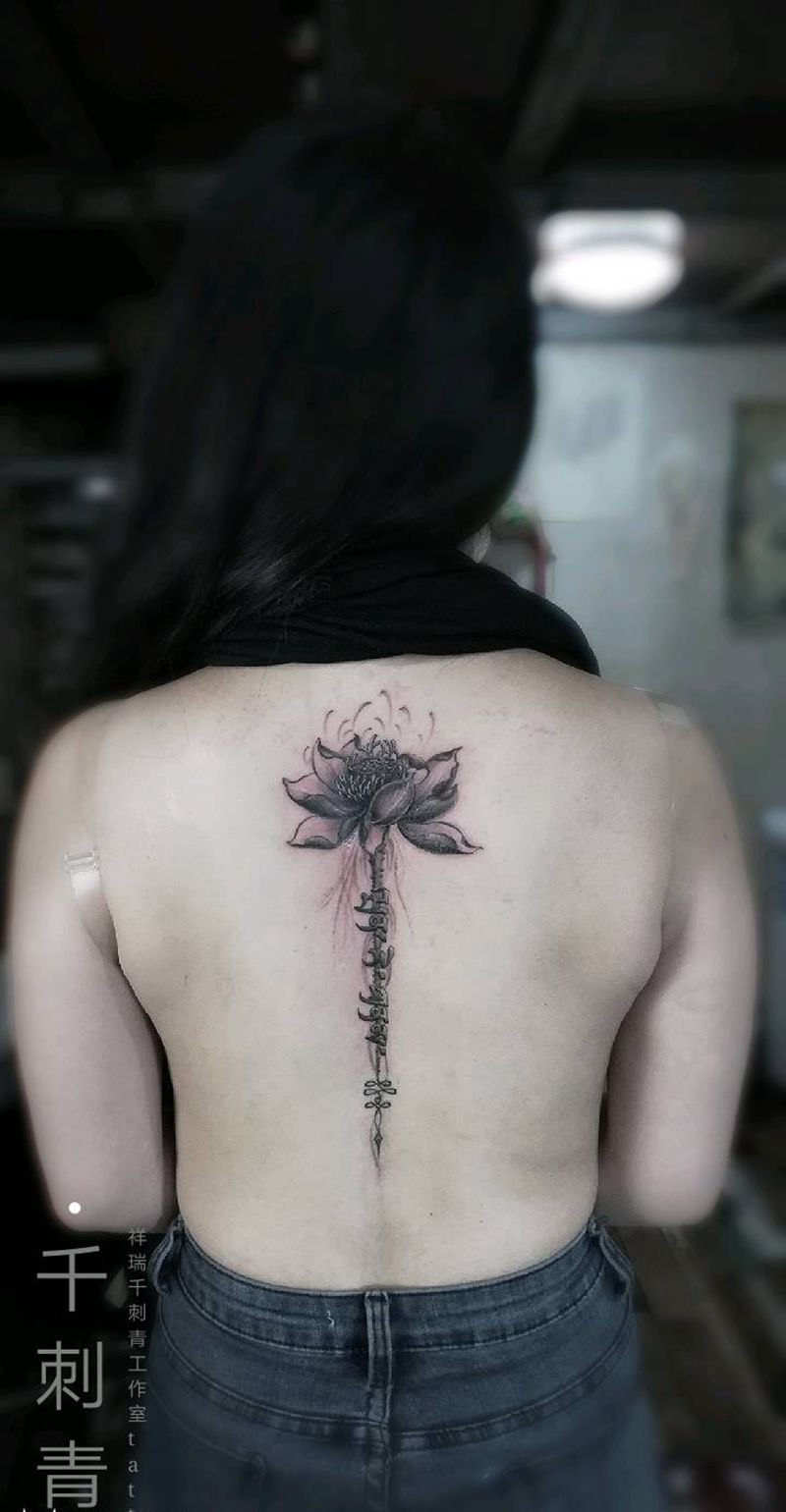 清莲纹身图片_背部新传统水墨莲花梵文纹身图案