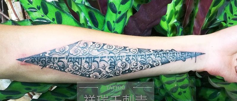 当前位置: 首页 >陕西省汉中市纹身店-祥瑞千刺青纹身图案>祥瑞的梵文和云纹身图片_手臂新传统梵文 祥云纹身图案