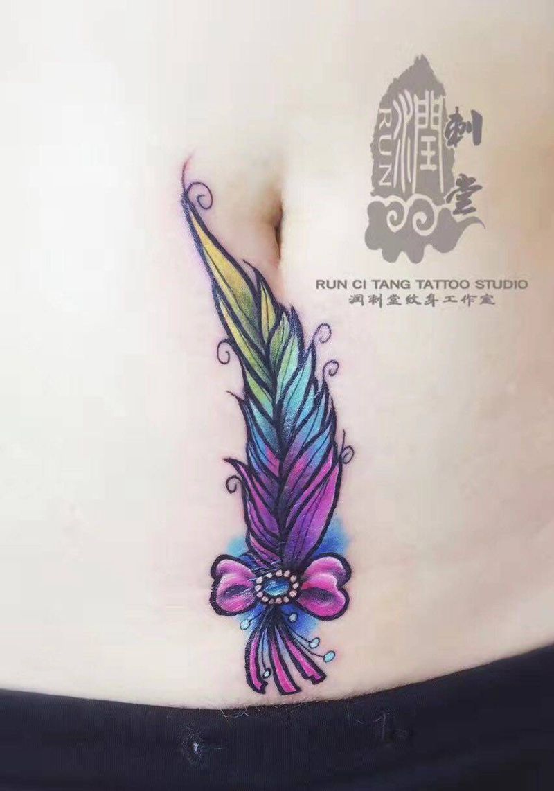 伤疤遮盖纹身图片_腹部水彩羽毛伤疤遮盖纹身图案