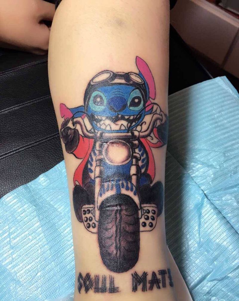 史迪仔骑哈雷纹身图片_欧美成品腿部原创纹身图案