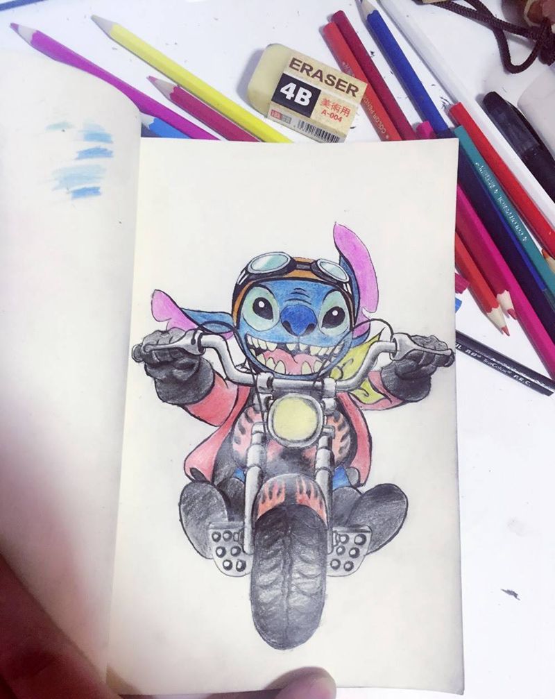 史迪仔骑哈雷纹身图片_欧美成品腿部原创纹身图案