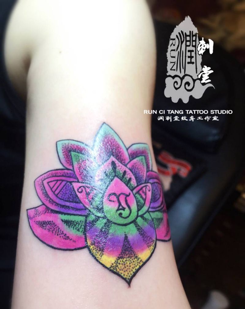 当前位置: 首页 >甘肃省兰州市纹身店-兰州润刺青工作室纹身图案>彩色点刺莲花纹身图片_成品手臂欧美清新几何图腾植物原创纹身图案