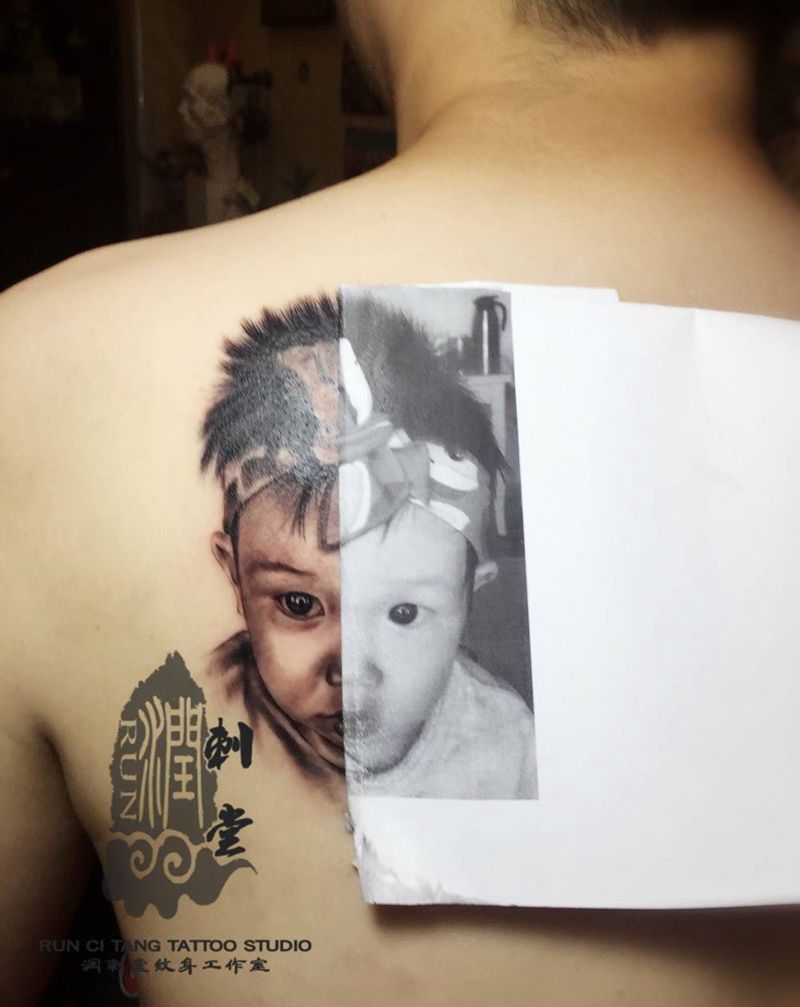 当前位置: 首页 >甘肃省兰州市纹身店-兰州润刺青工作室纹身图案>宝宝肖像纹身图片_成品背部写实肖像人物原创纹身图案