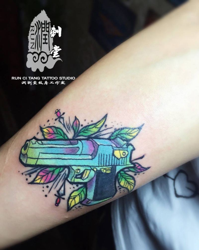 当前位置: 首页 >甘肃省兰州市纹身店-兰州润刺青工作室纹身图案>润刺青出品#手枪#纹身图片_成品手臂手部欧美静物原创几何纹身图案