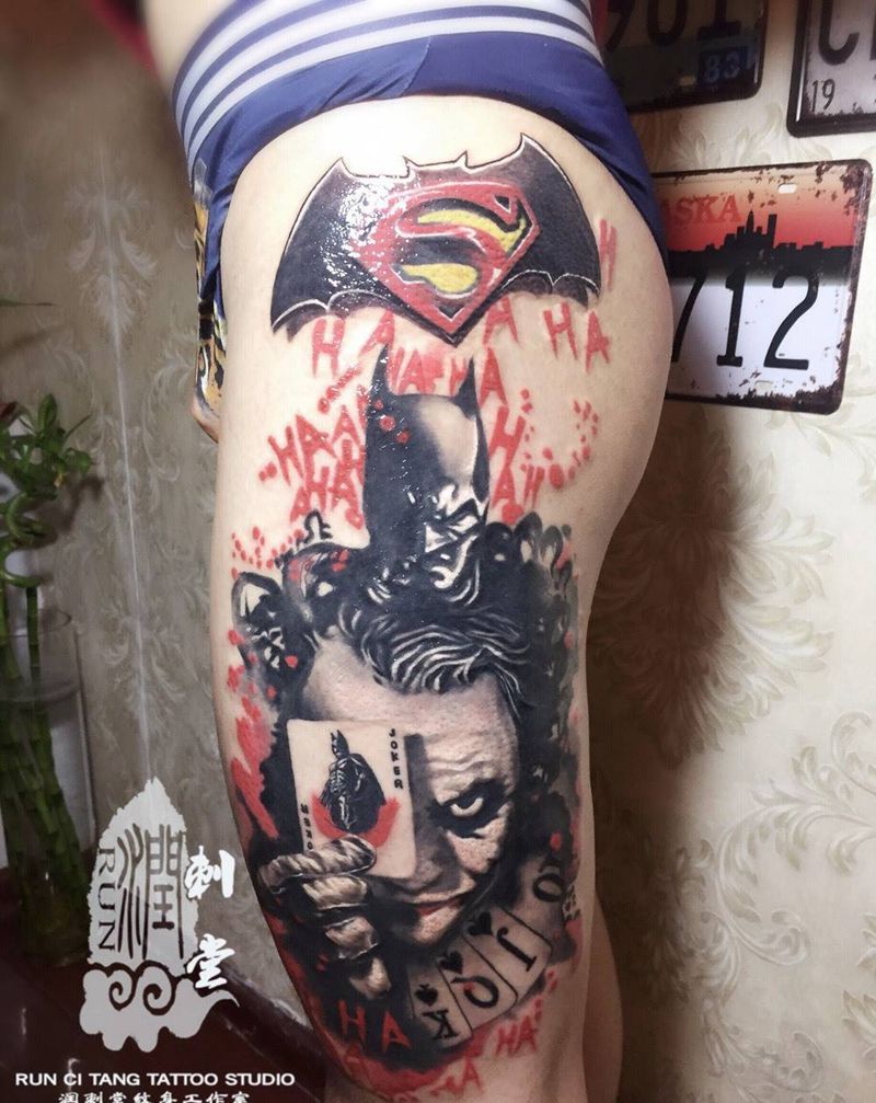 当前位置: 首页 >甘肃省兰州市纹身店-兰州润刺青工作室纹身图案>The Dark Knight纹身图片_成品腿部欧美肖像人物几何鬼神纹身图案