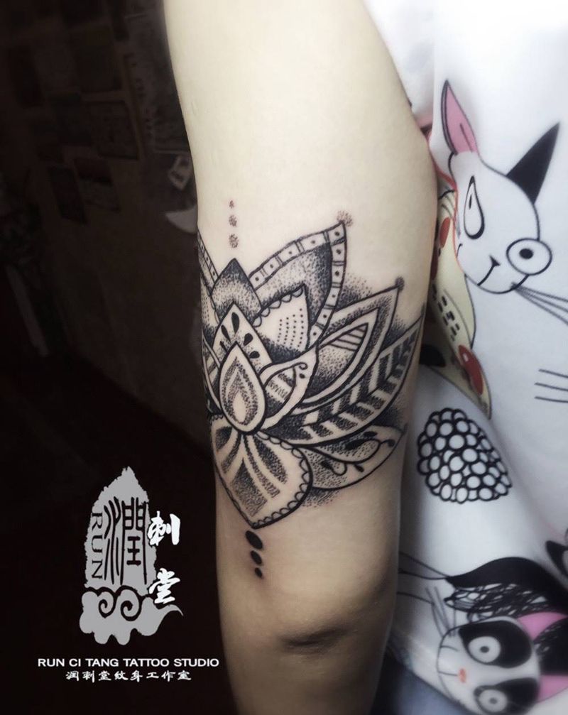 润刺青出品#点刺莲花#纹身图片_成品手臂手部清新传统植物宗教纹身图案