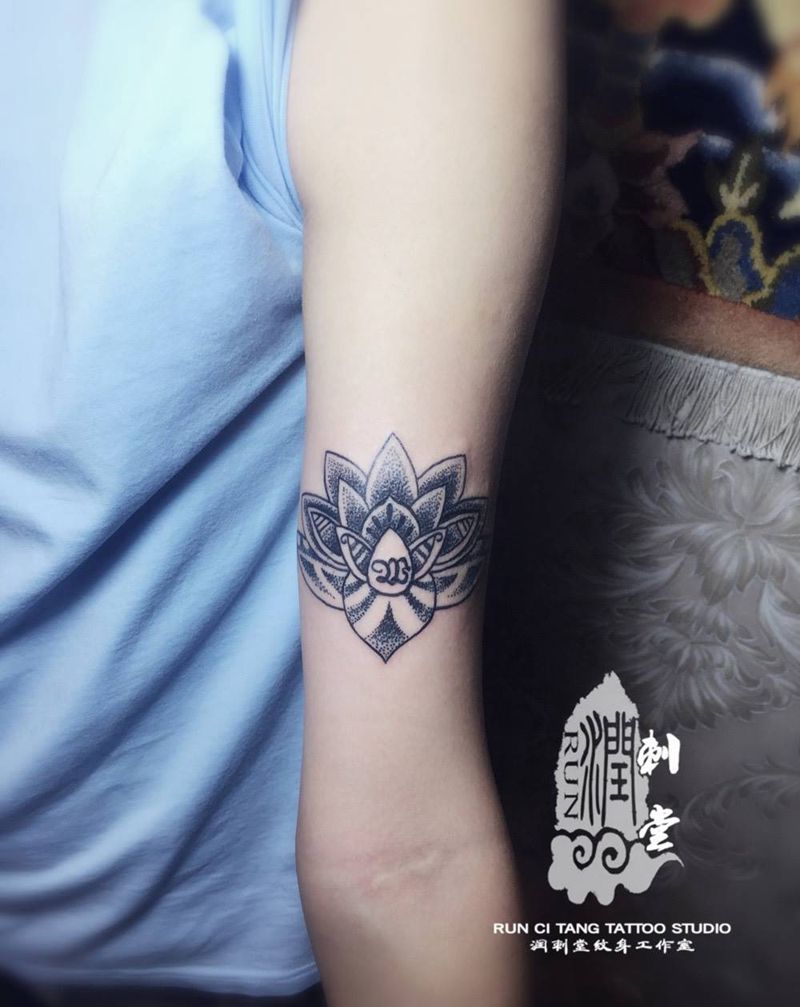 当前位置: 首页 >甘肃省兰州市纹身店-兰州润刺青工作室纹身图案>点刺莲花纹身图片_成品手臂欧美清新几何植物图腾纹身图案