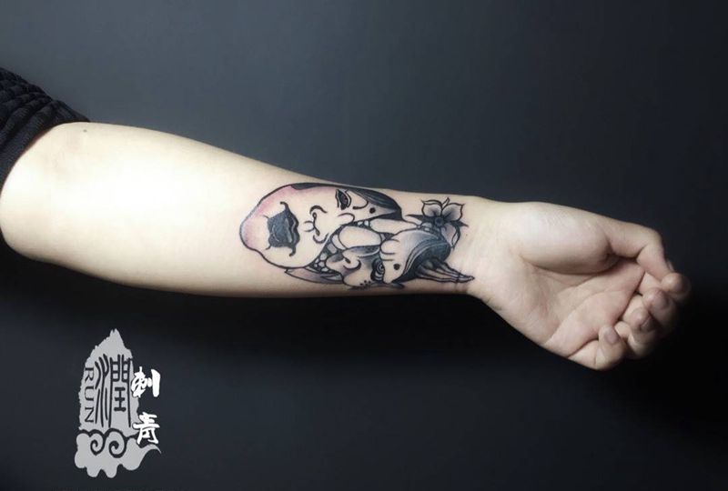 当前位置: 首页 >甘肃省兰州市纹身店-兰州润刺青工作室纹身图案>遮盖纹身图片_成品手臂手部传统人物宗教鬼神纹身图案