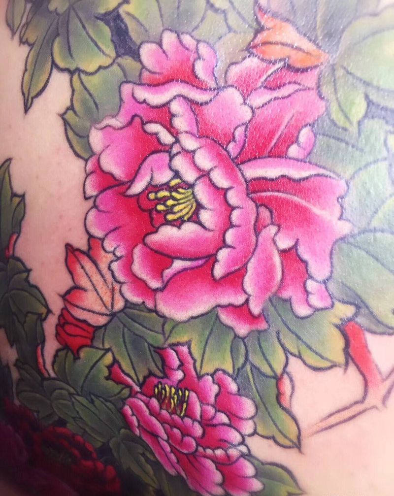 当前位置: 首页 >甘肃省兰州市纹身店-兰州润刺青工作室纹身图案>中国风工笔牡丹纹身图片_成品背部国画植物纹身图案