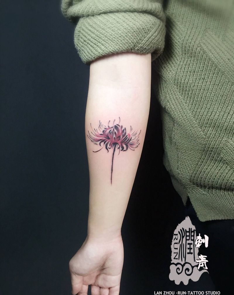 当前位置: 首页 >甘肃省兰州市纹身店-兰州润刺青工作室纹身图案>彼岸花纹身图片_成品手臂手部清新植物纹身图案
