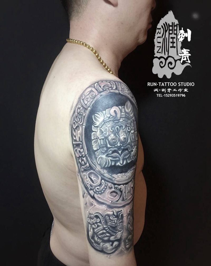 玛雅石裂遮盖,已恢复纹身图片_成品手臂手部传统写实几何图腾鬼神宗教纹身图案