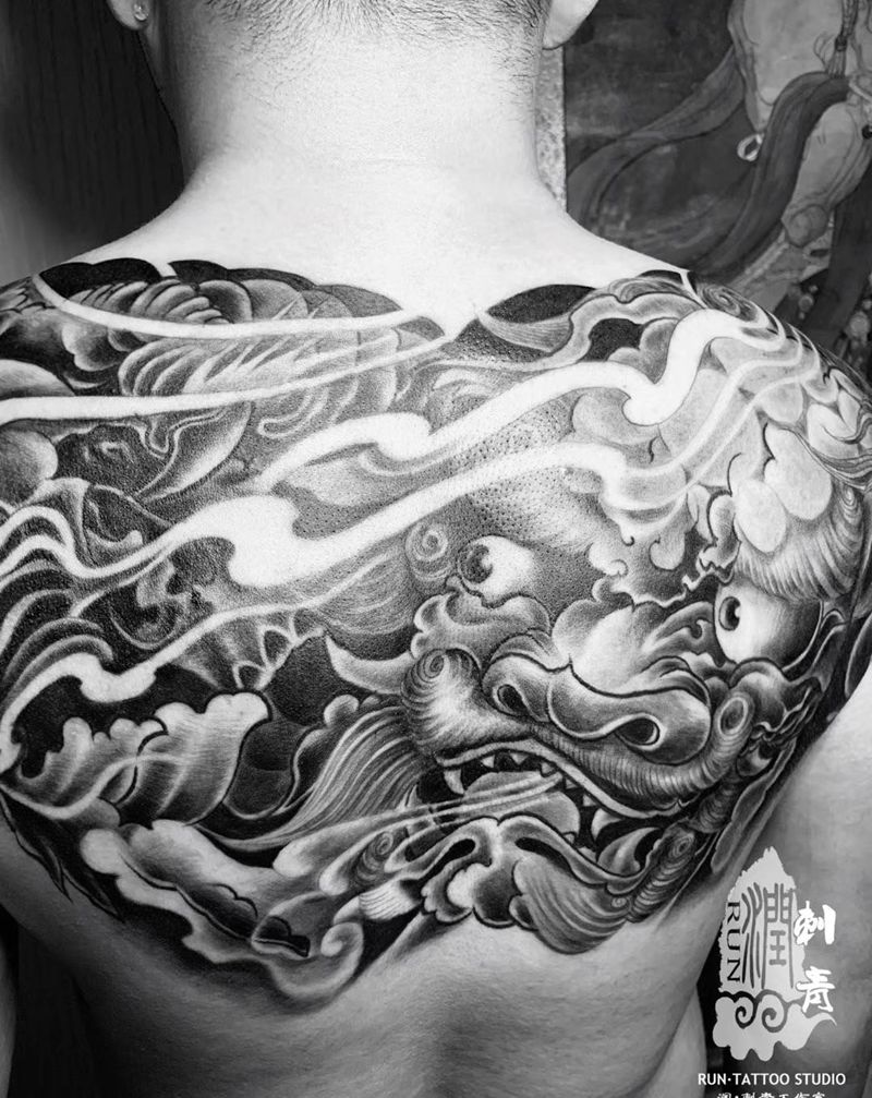 当前位置: 首页 >甘肃省兰州市纹身店-兰州润刺青工作室纹身图案>半背唐狮纹身图片_背部颈部老传统唐狮纹身图案