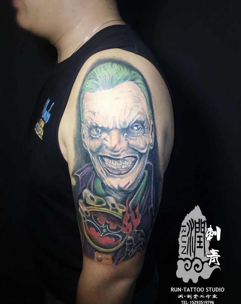 当前位置: 首页 >甘肃省兰州市纹身店-兰州润刺青工作室纹身图案>旧图遮盖,小丑纹身图片_手臂手部欧美写实小丑旧图遮盖纹身图案
