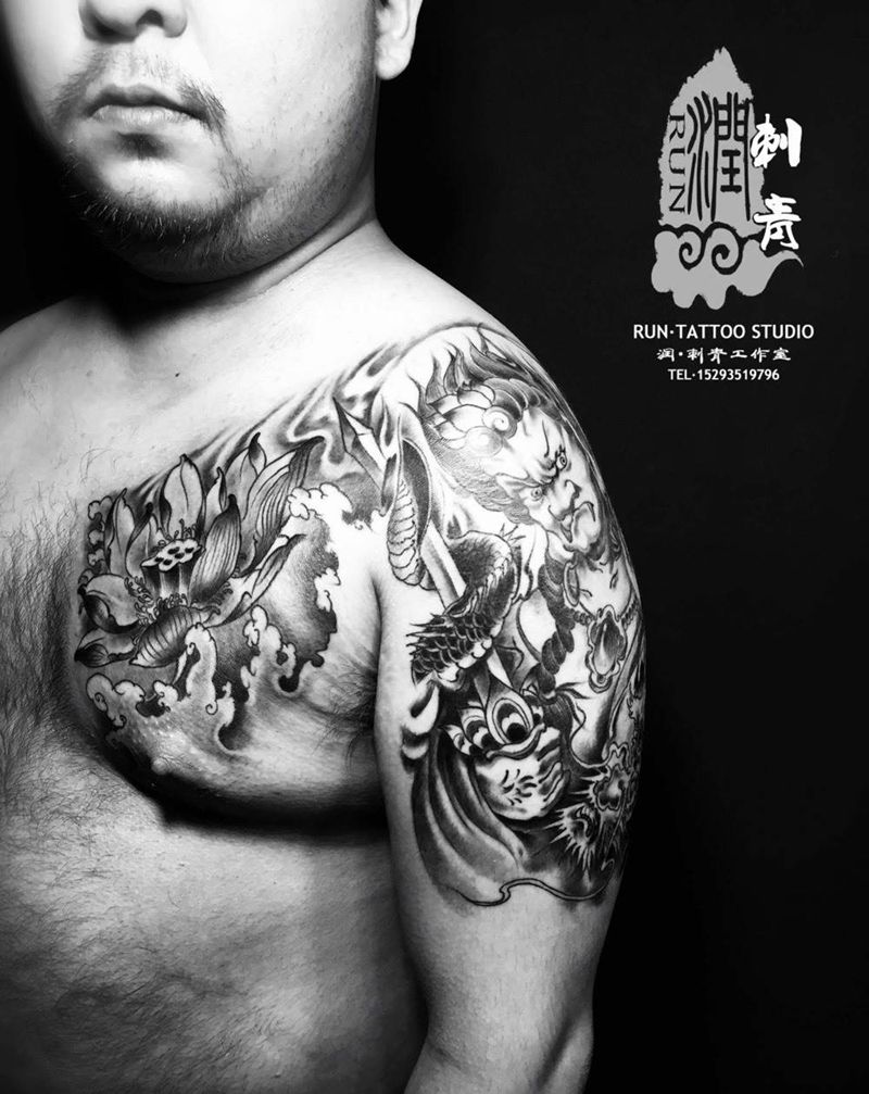 当前位置: 首页 >甘肃省兰州市纹身店-兰州润刺青工作室纹身图案>不动尊菩萨半甲纹身图片_成品胸部手臂传统植物鬼神宗教纹身图案