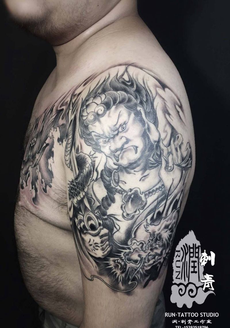 当前位置: 首页 >甘肃省兰州市纹身店-兰州润刺青工作室纹身图案>不动尊菩萨半甲纹身图片_成品胸部手臂传统植物鬼神宗教纹身图案