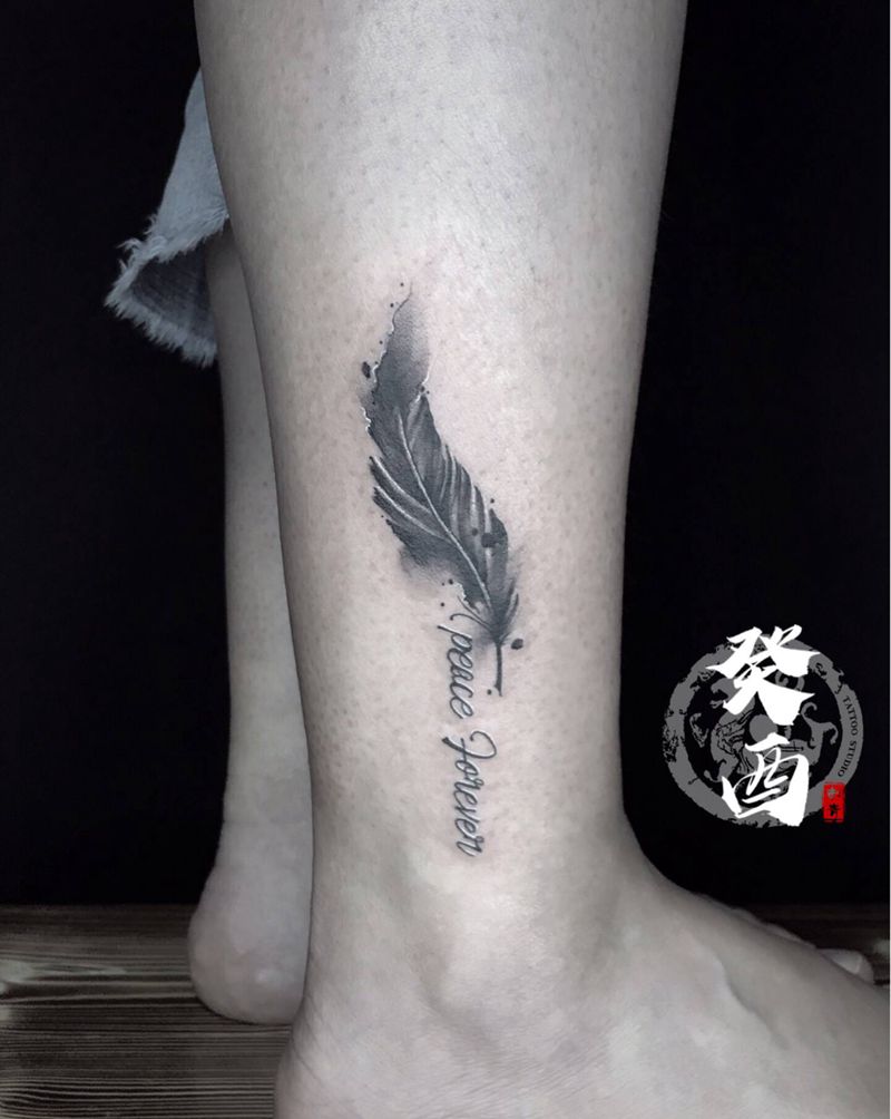 羽毛纹身图片_腿部水墨小清新纹身图案