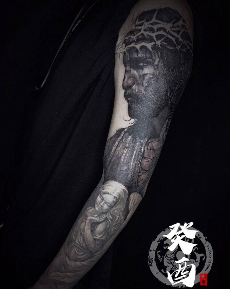 当前位置: 首页 >甘肃省兰州市纹身店-癸酉刺青纹身图案>耶稣受难(未完)纹身图片_手臂欧美写实纹身图案
