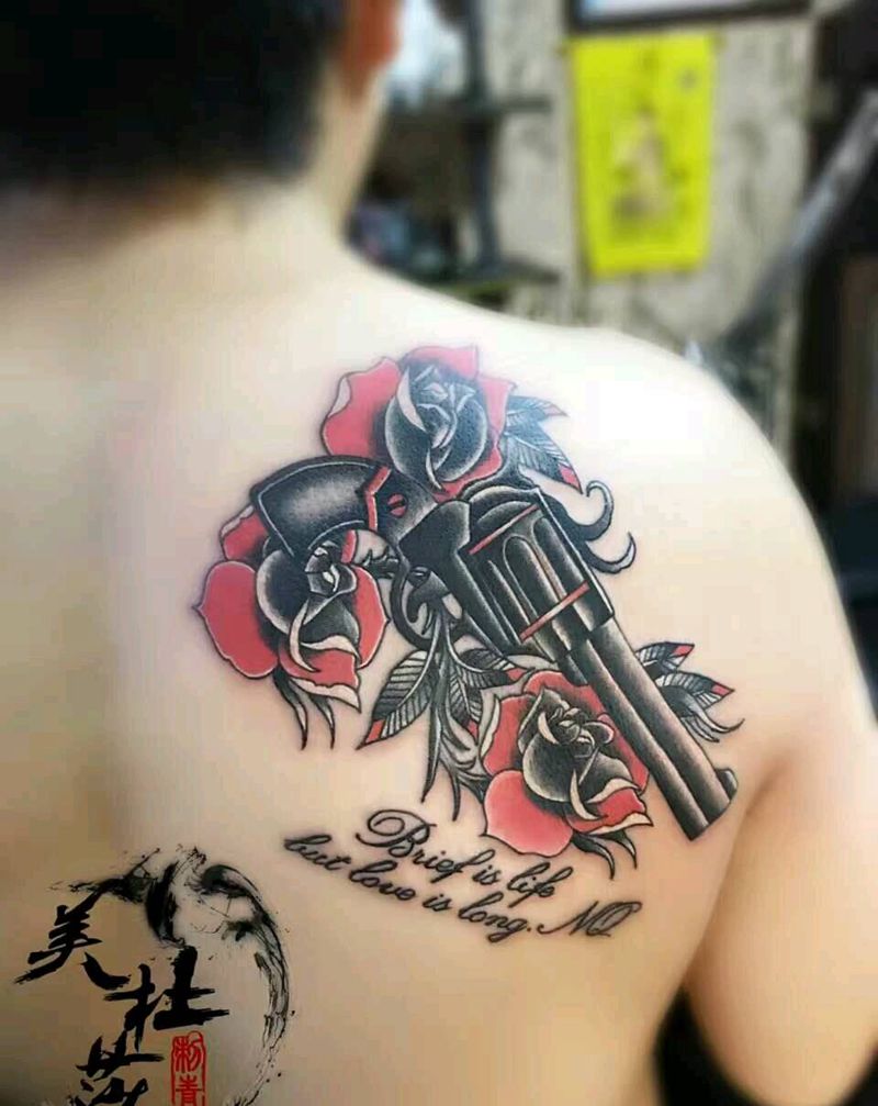 枪花纹身图片_背部欧美贴纸静物情侣生活成品纹身图案