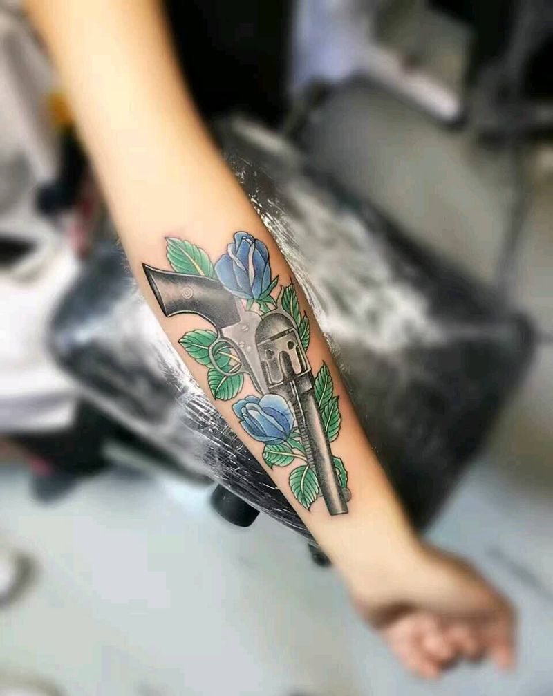 手枪纹身图片_手臂欧美植物静物生活遮盖成品纹身图案