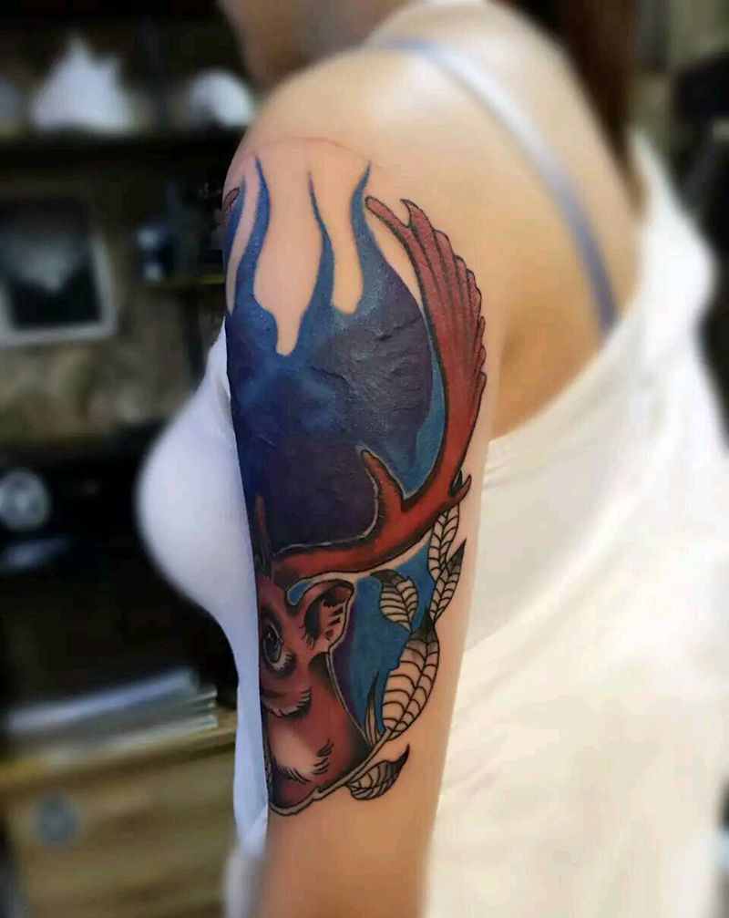 当前位置: 首页 >甘肃省兰州市纹身店-兰州美杜莎刺青纹身图案>鹿纹身图片_手臂欧美传统动物原创生活遮盖成品纹身图案