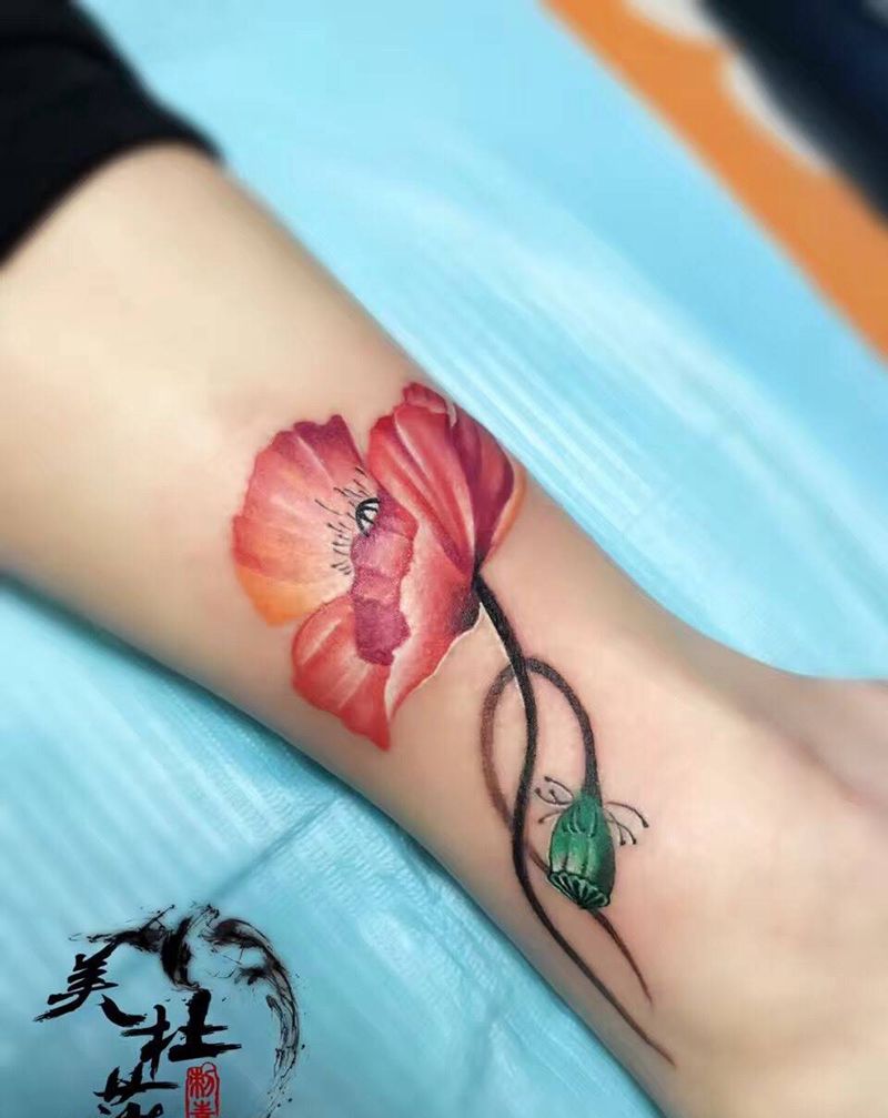 罂粟花。纹身图片_成品腿部清新植物纹身图案