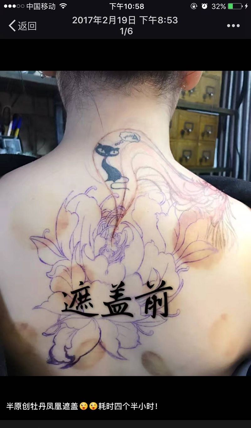 当前位置: 首页 >甘肃省兰州市纹身店-兰州美杜莎刺青纹身图案>半原创牡丹凤凰遮盖。纹身图片_成品手稿背部传统动物植物纹身图案