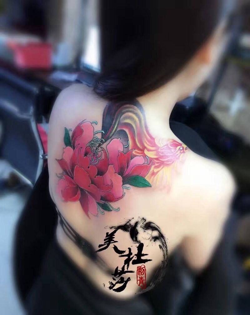 半原创牡丹凤凰遮盖。纹身图片_成品手稿背部传统动物植物纹身图案
